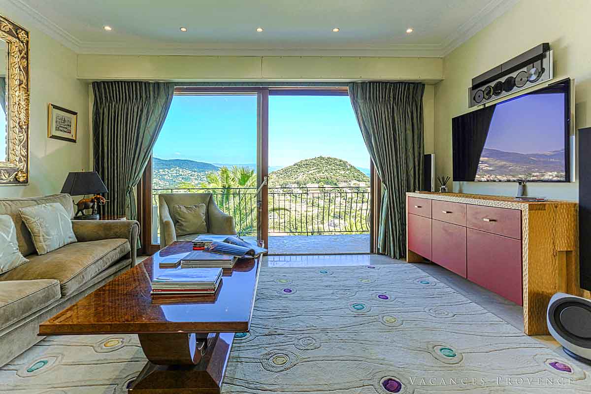 The TV Room has comfortable seating and a 42 inch plasma TV with Sky TV programmes, a Bang & Olufsen music system, plentiful range of CDs and air-conditioning. Large sliding doors open onto the balcony with commanding views across to the bay of Cannes.
