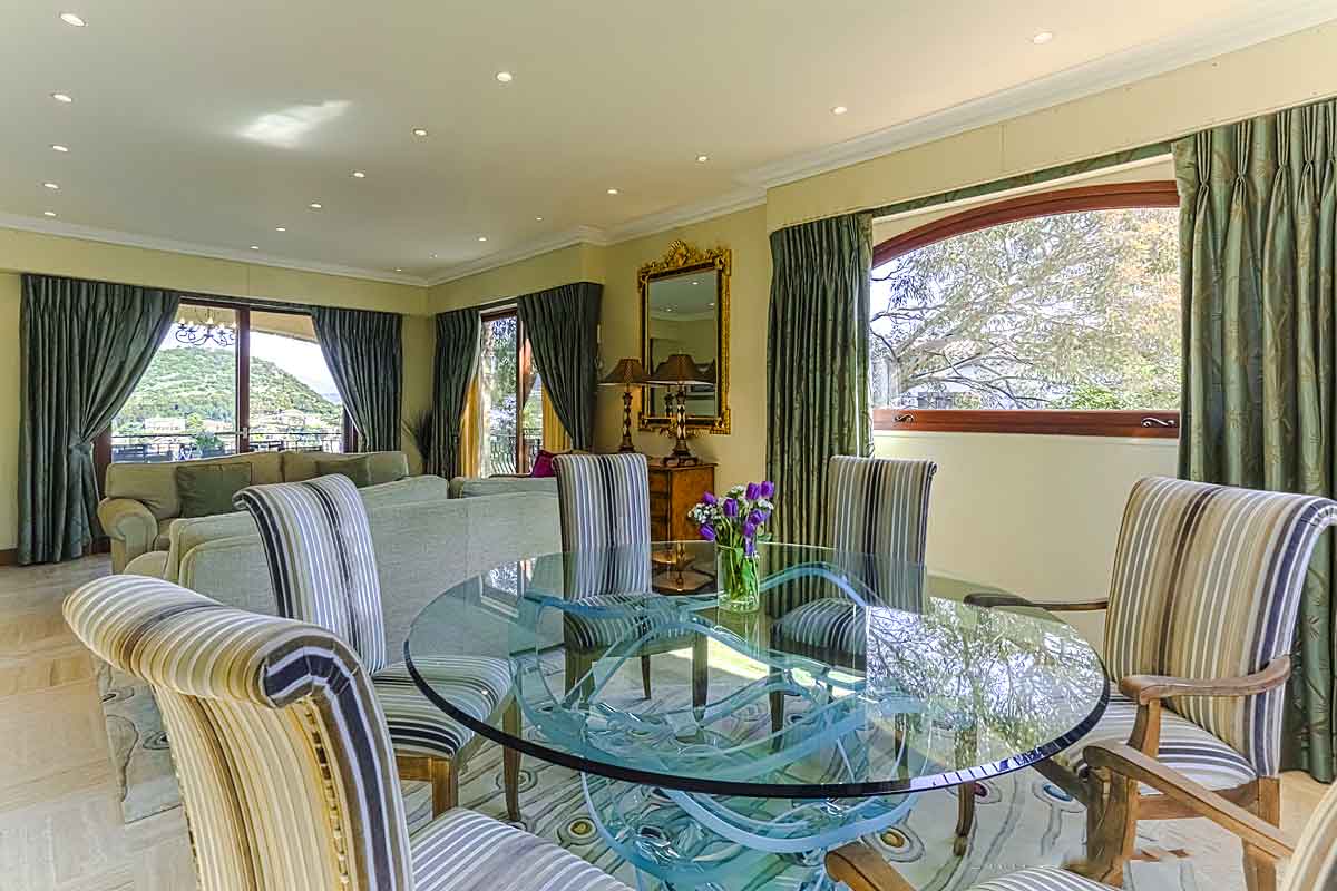 A more formal and beautifully furnished room with two sofas, an armchair and air-conditioning. The dining area has a very ornate glass dining table and seating for 6 people. In the lounge area large sliding doors open onto the balcony with the same views as the TV room. In the dining area windows open onto the garden.