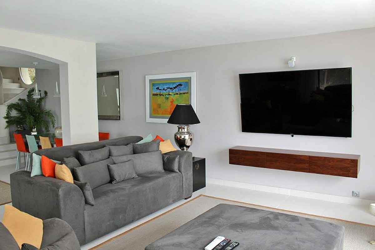 The entrance to the villa is on the ground floor which leads to the kitchen, living room and dining rooms and onto the dining and pool terraces. The Bo Concept dining table sits 10 people. With high quality furnishings, a 72' smart television with international channels and a music system inside the villa and out, it's a holiday home for discerning guests.