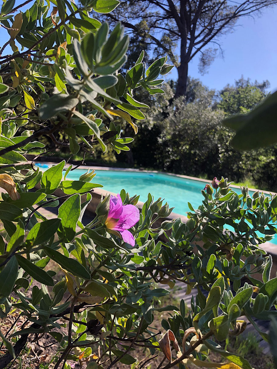 The huge garden is surrounded by pine trees, vineyards and olive trees.