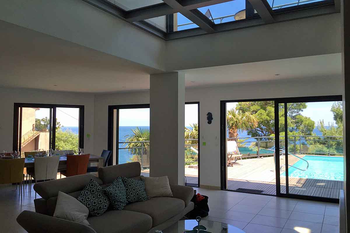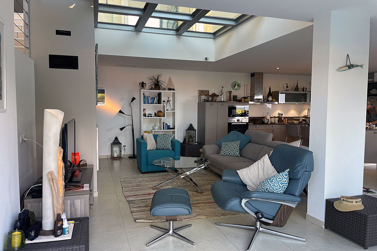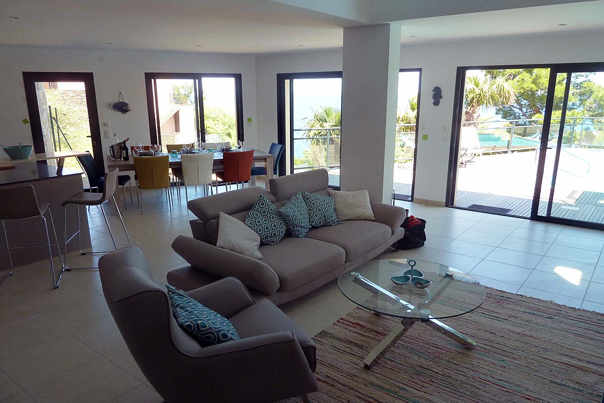 The contemporary open plan light and airy living area is surrounded by huge windows which offer amazing far reaching views of the Mediterranean.