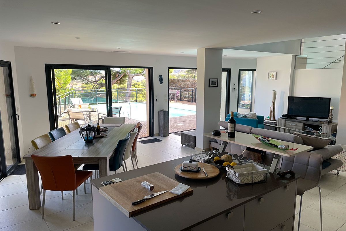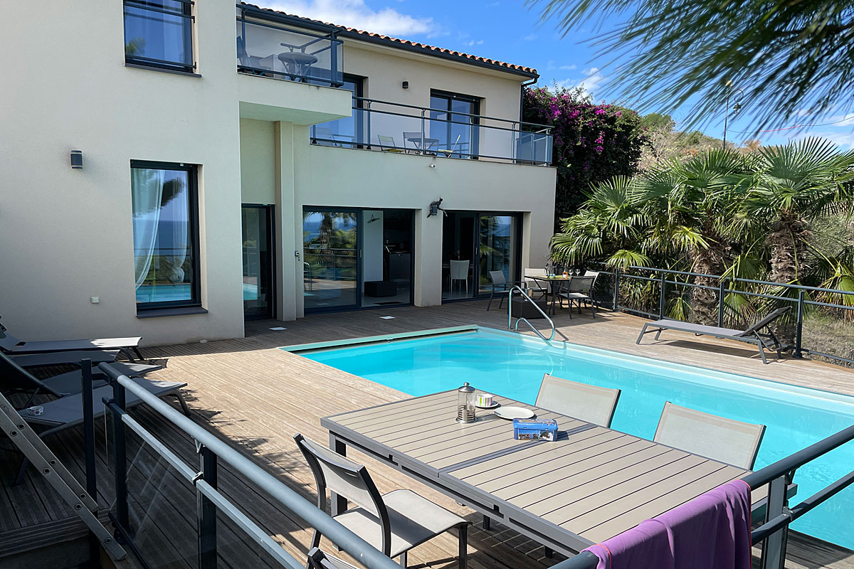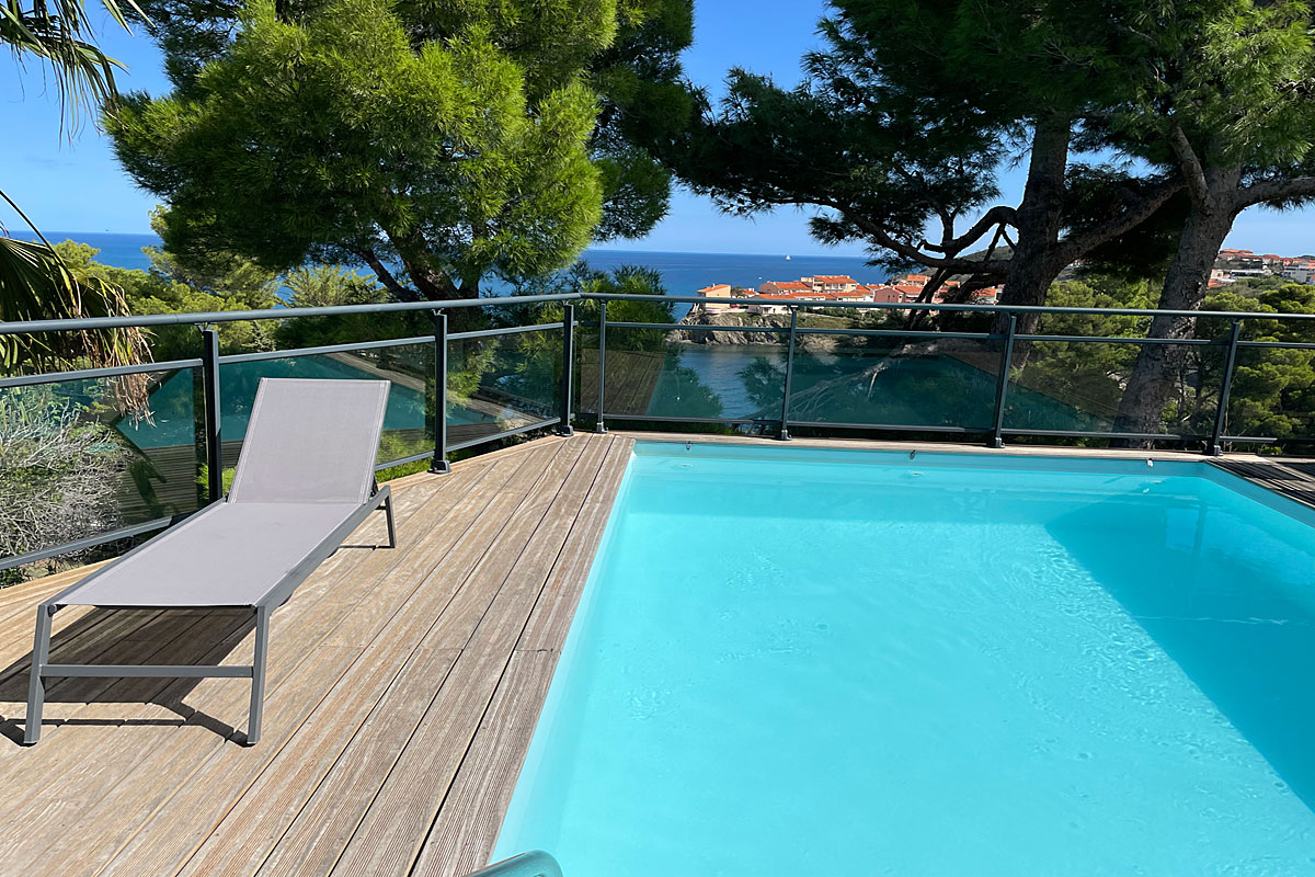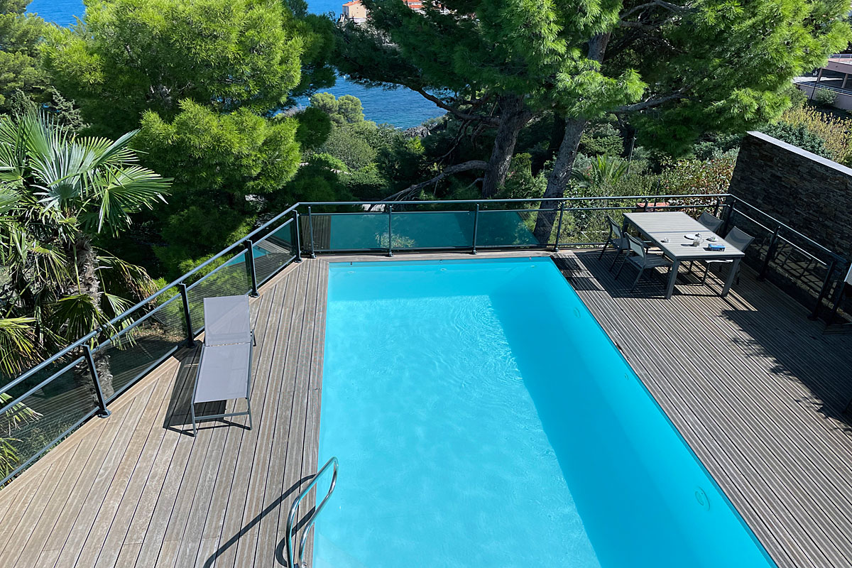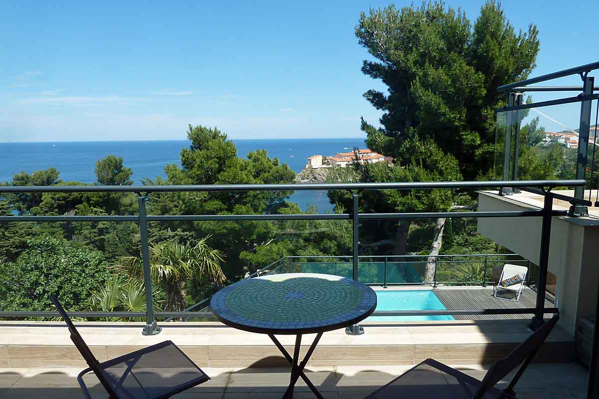 Holiday villa in Collioure, South of France, air-conditioned, stunning sea views, private heated pool and 3 bedrooms with en suite bathrooms, to sleep 6 adults and 2 children. South of France Architect designed modern Villa with fabulous sea views over Collioure in the Languedoc. A stunning position, , private heated pool (treated with salt), UK TV, only a few minutes' walk to the beach and local restaurants.