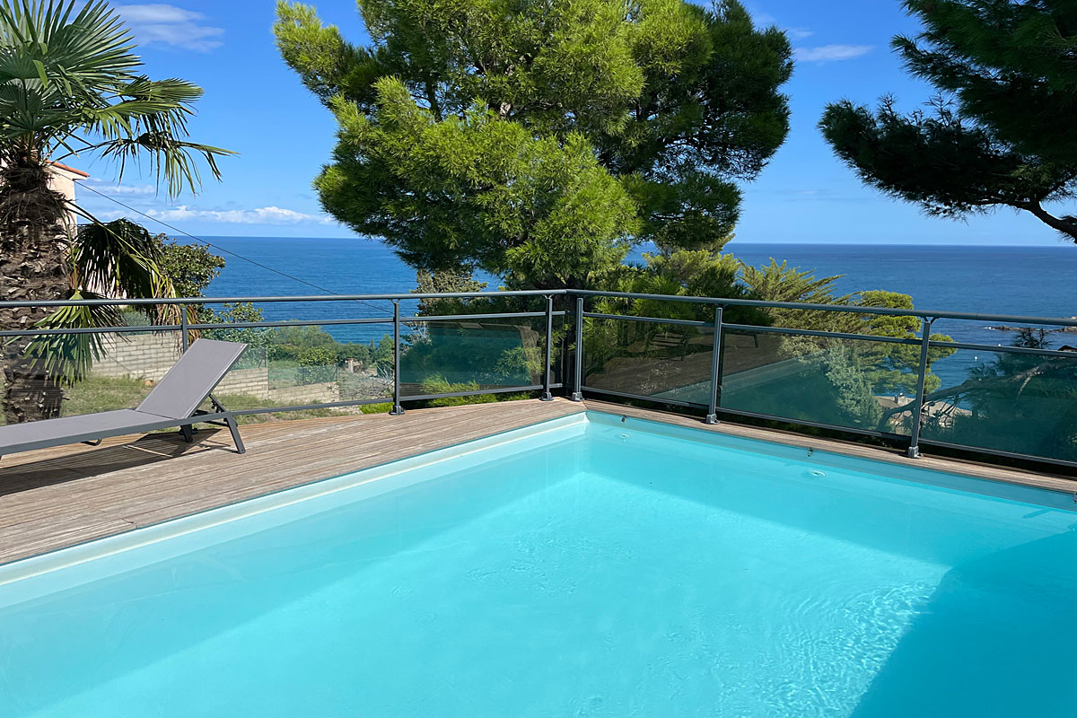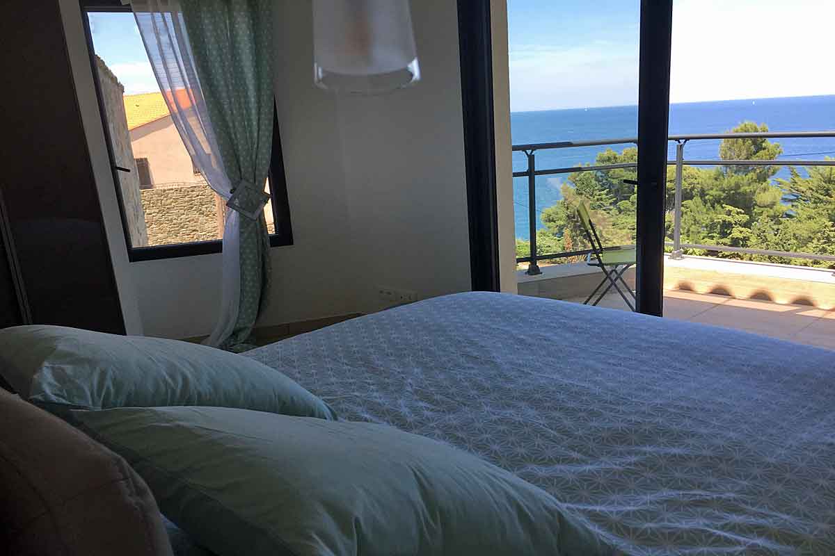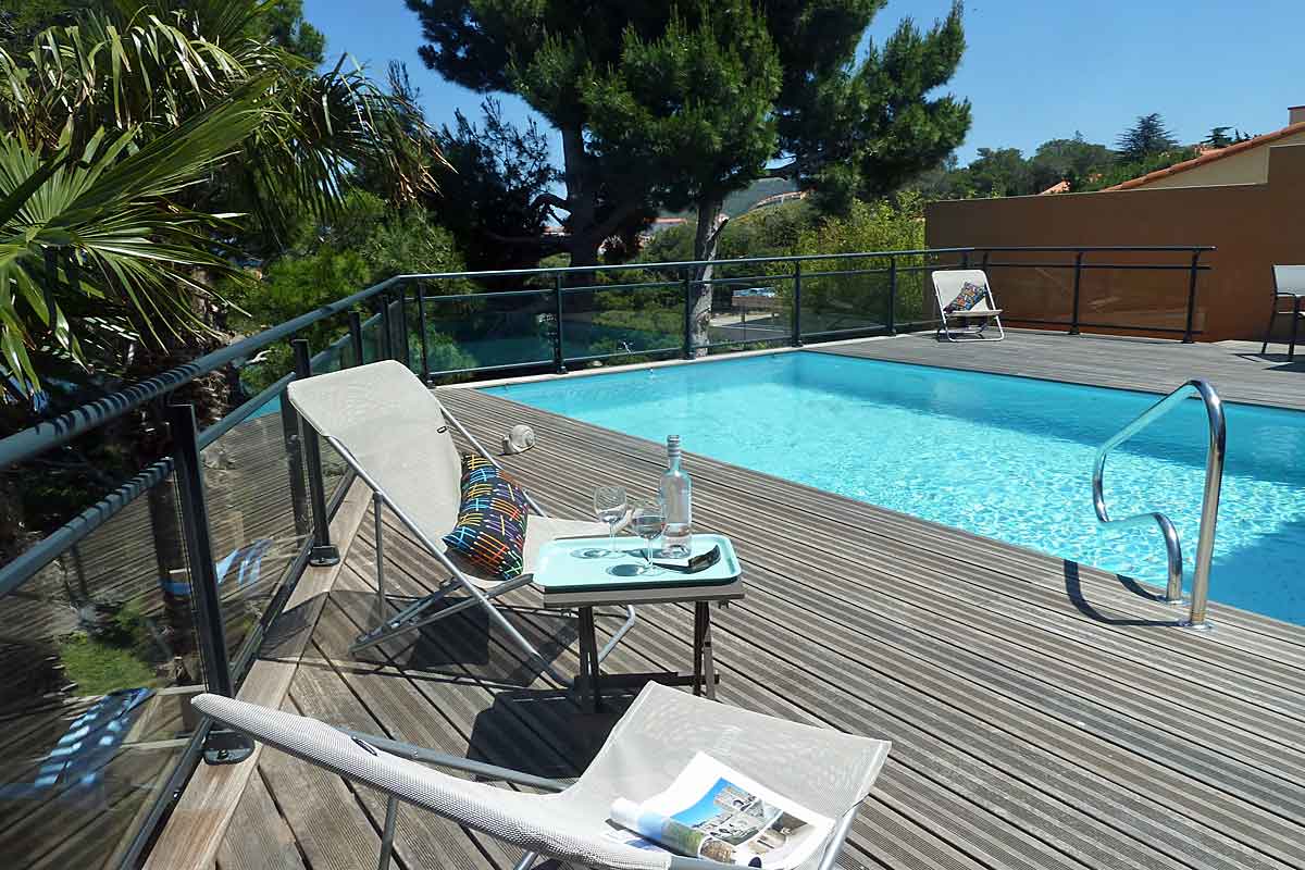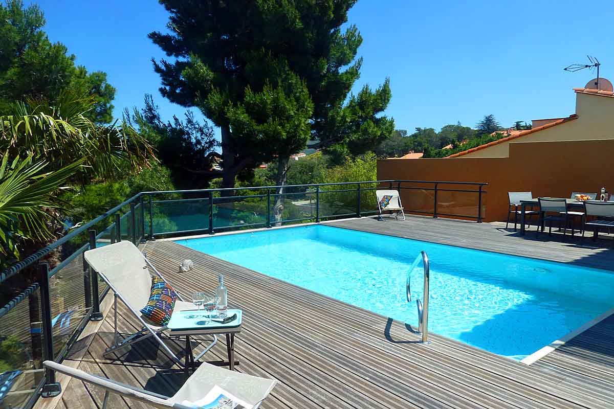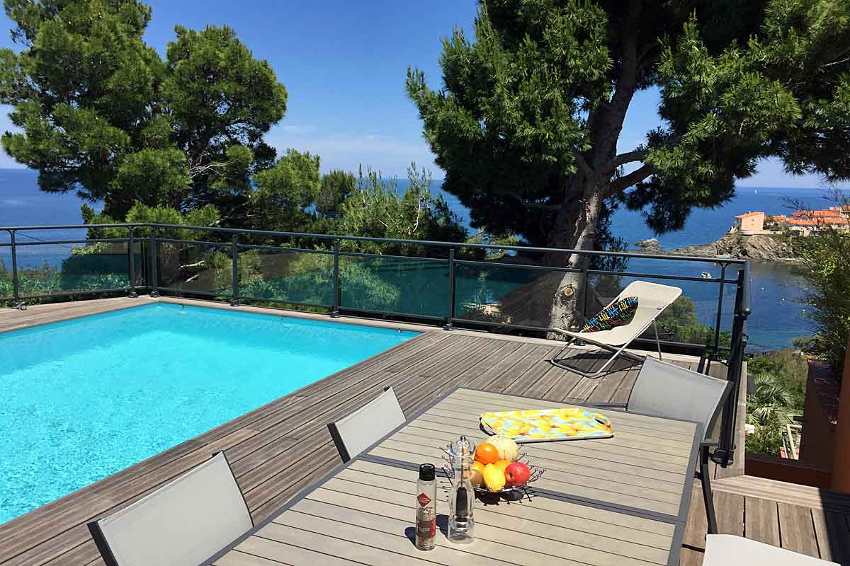 Holiday villa in Collioure, South of France, with stunning sea views, private heated pool and 3 bedrooms with en suite bathrooms, to sleep 6 adults and 2 children.