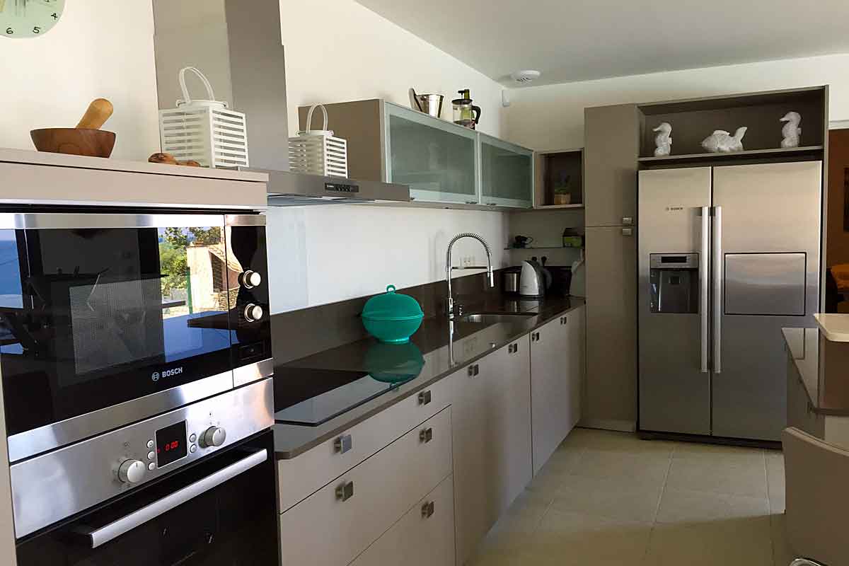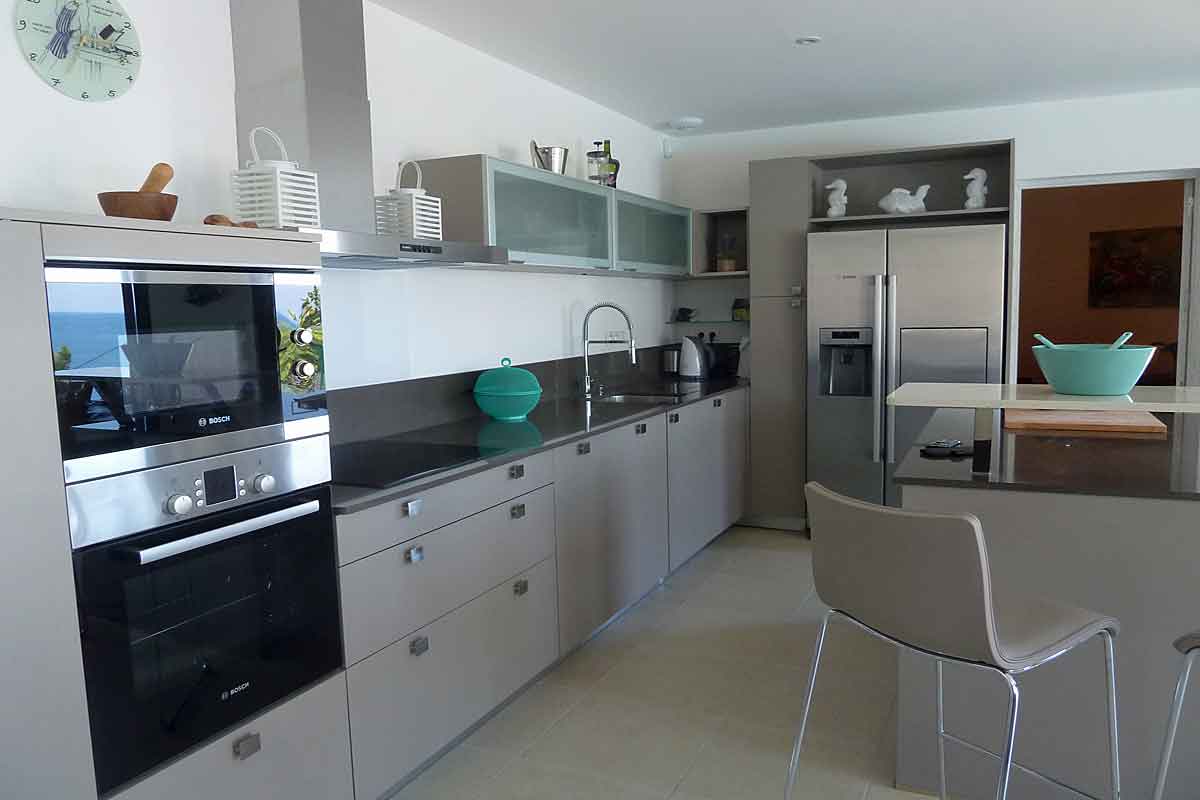 A contemporary kitchen space is fully equipped and even has 2 ovens! and a large American style fridge freezer gives plenty of space for stocking the excellent local white wine! The kitchen island with breakfast bar and stools means you can eat your croissant, sip your coffee and admire the sea to sky view.