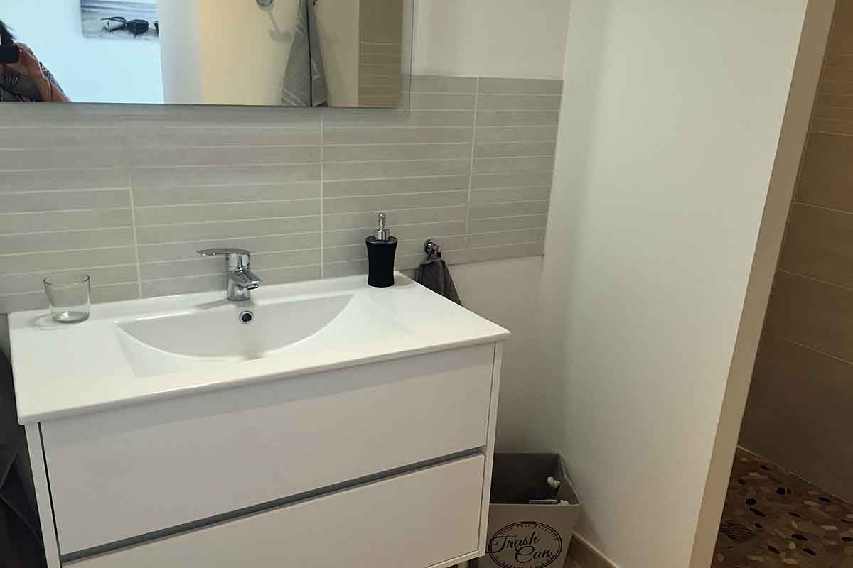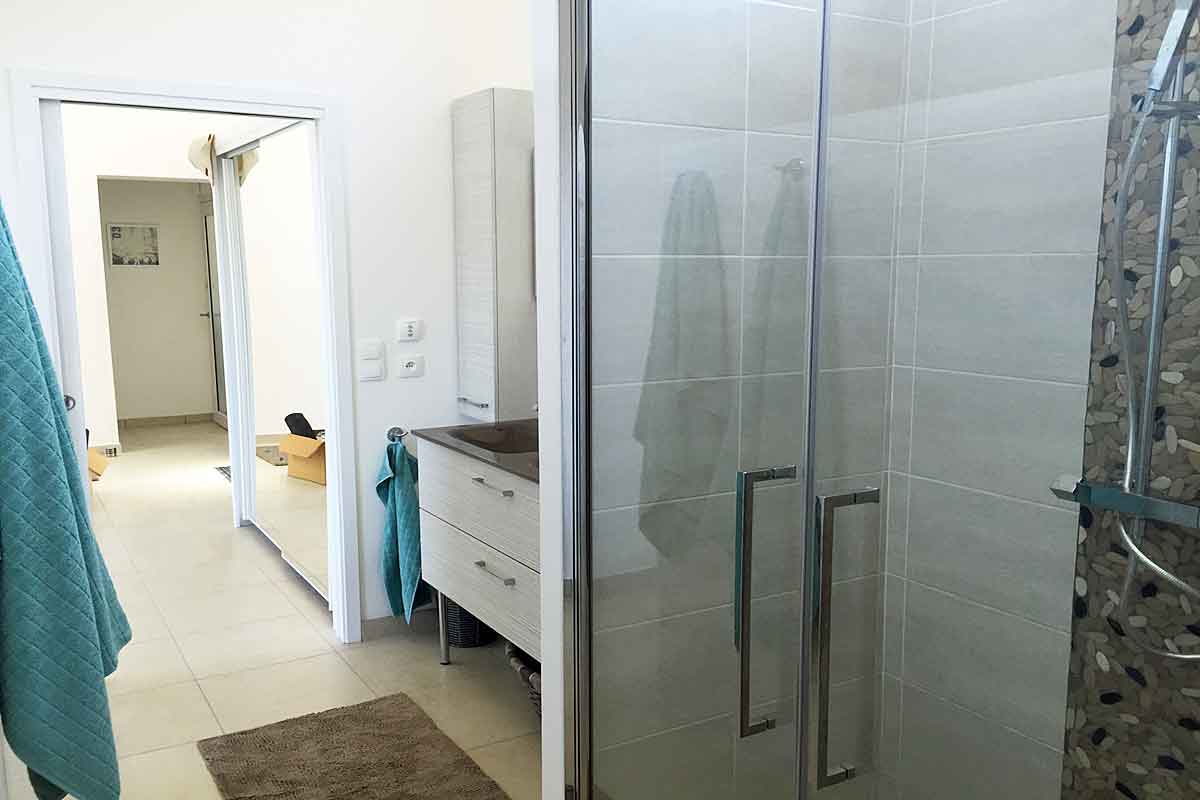 5 steps lead up to Bedroom 3 - air-conditioned with a double bed (160cm), patio doors lead on to a private balcony, again with sea views. The en suite has a walk-in shower and vanity unit.
