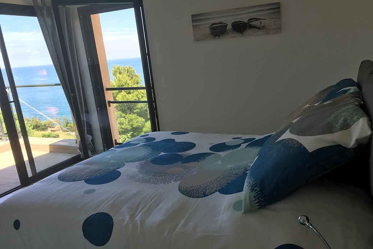 3 steps from the living area lead to Bedroom 1 - air-conditioned, opening on to the pool terrace with incredible sea views. There is an en suite shower and separate wc.