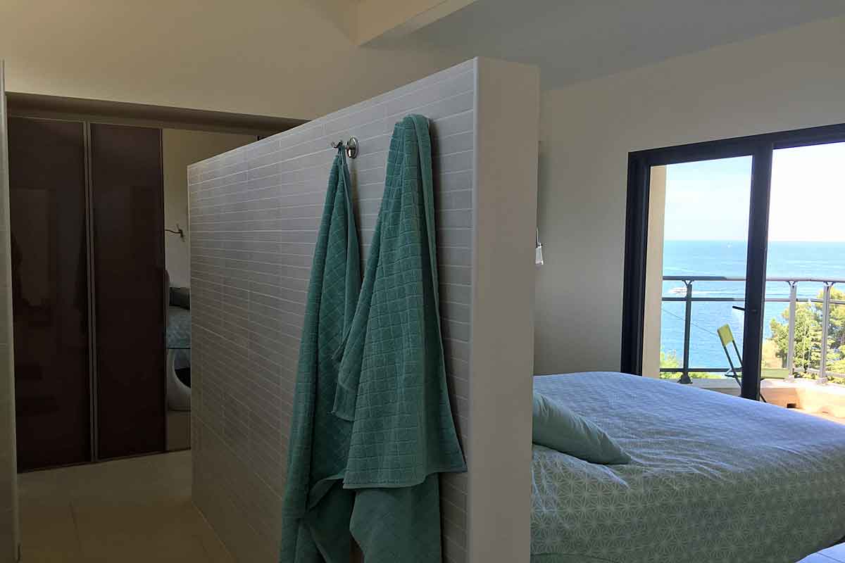 To the left is Bedroom 2 - air-conditioned with a large king size bed (180cm) views over the sea and doors out on to a private terrace - just perfect for your morning tea or coffee. The en suite is clever in design with the wall being the beds headboard, behind this is a large walk-in shower and a vanity unit with double sinks. The wc is separate and behind a closed door.