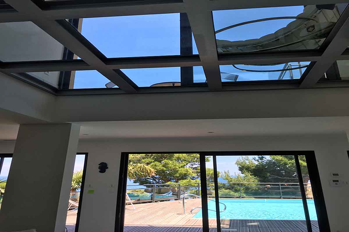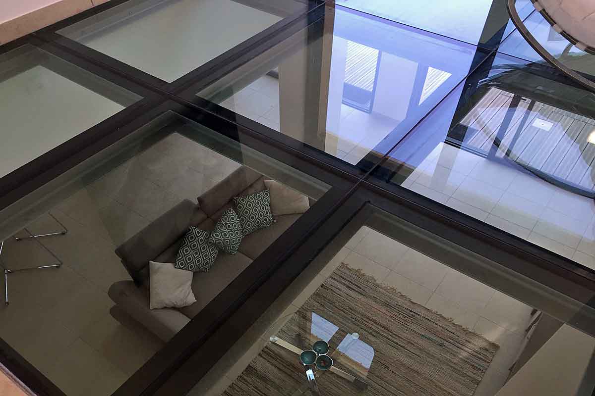 A stunning glass floor above the living area leads to the upper terrace, the special glass blocks stay cool in the heat of the summer months.
