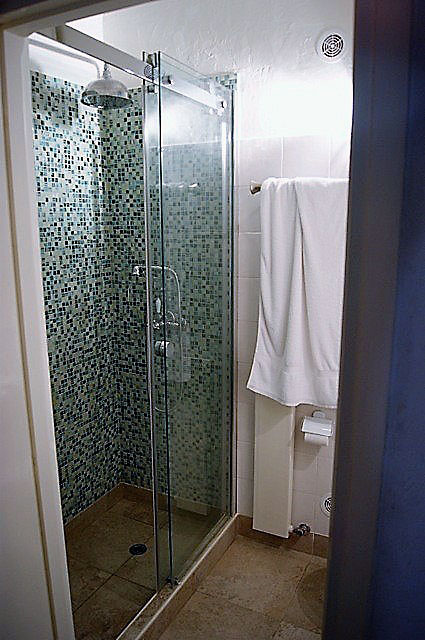 Bathroom with bath with shower overhead