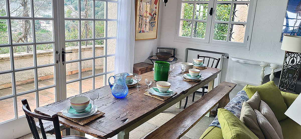Pretty views onto the terrace where there is a glorious wisteria vine. French doors opening out on to sheltered terrace with stunning views over the South of France; Baie des Anges, Antibes and the sea.