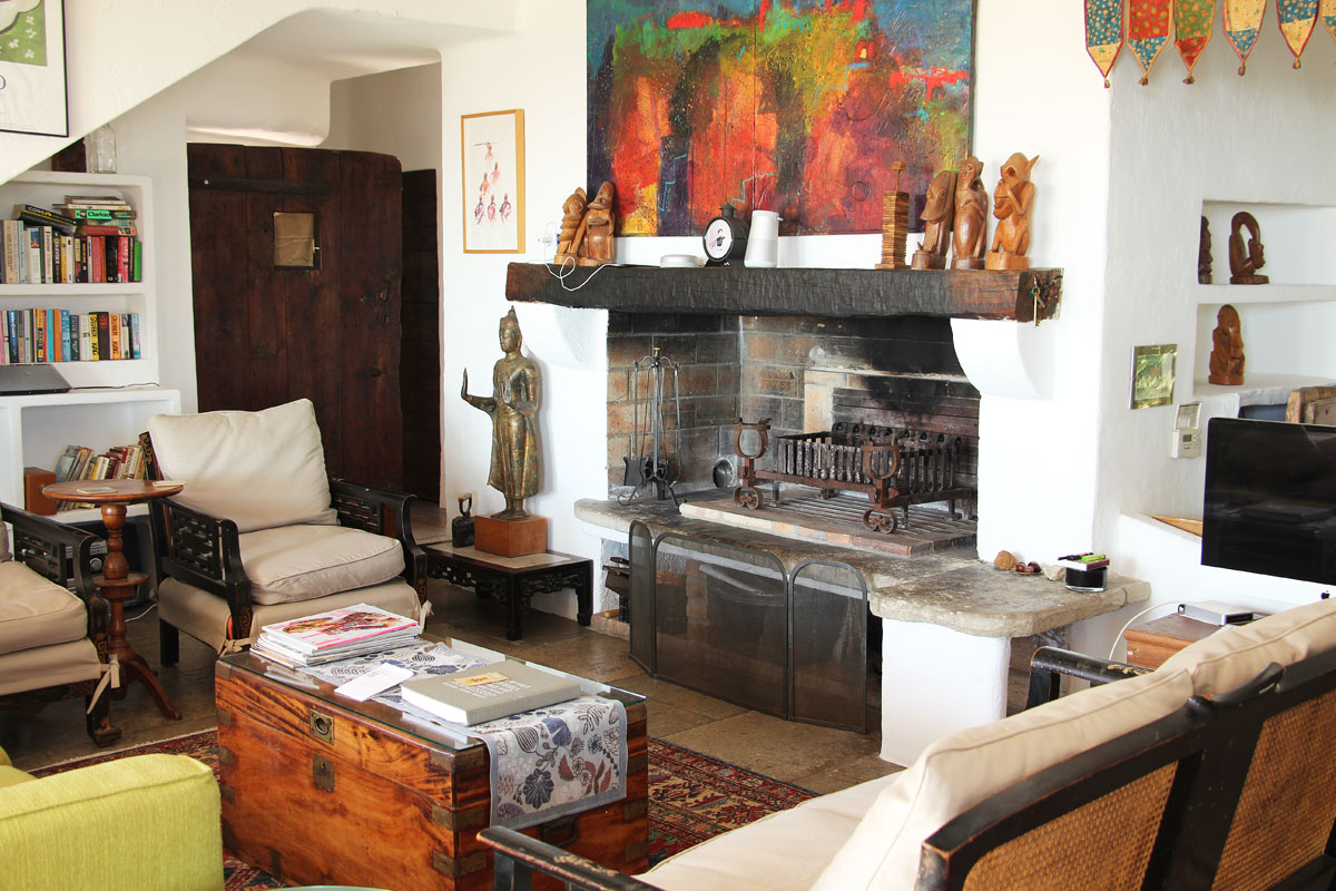 The 2nd living room, also downstairs, has antique flagstone flooring throughout and a large seating area with leather furniture and TV. The living room has a fireplace and a desk with doors onto a terrace with ample space for dining for 8.