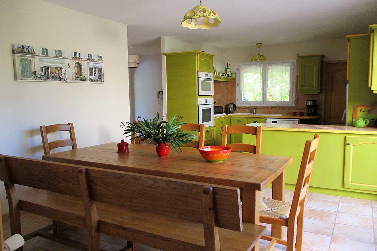 The kitchen, although not the most modern, has everything you need for a family holiday including a dining table with benches and chairs, plus access out to the outdoor BBQ terrace and dining table for alfresco meals.