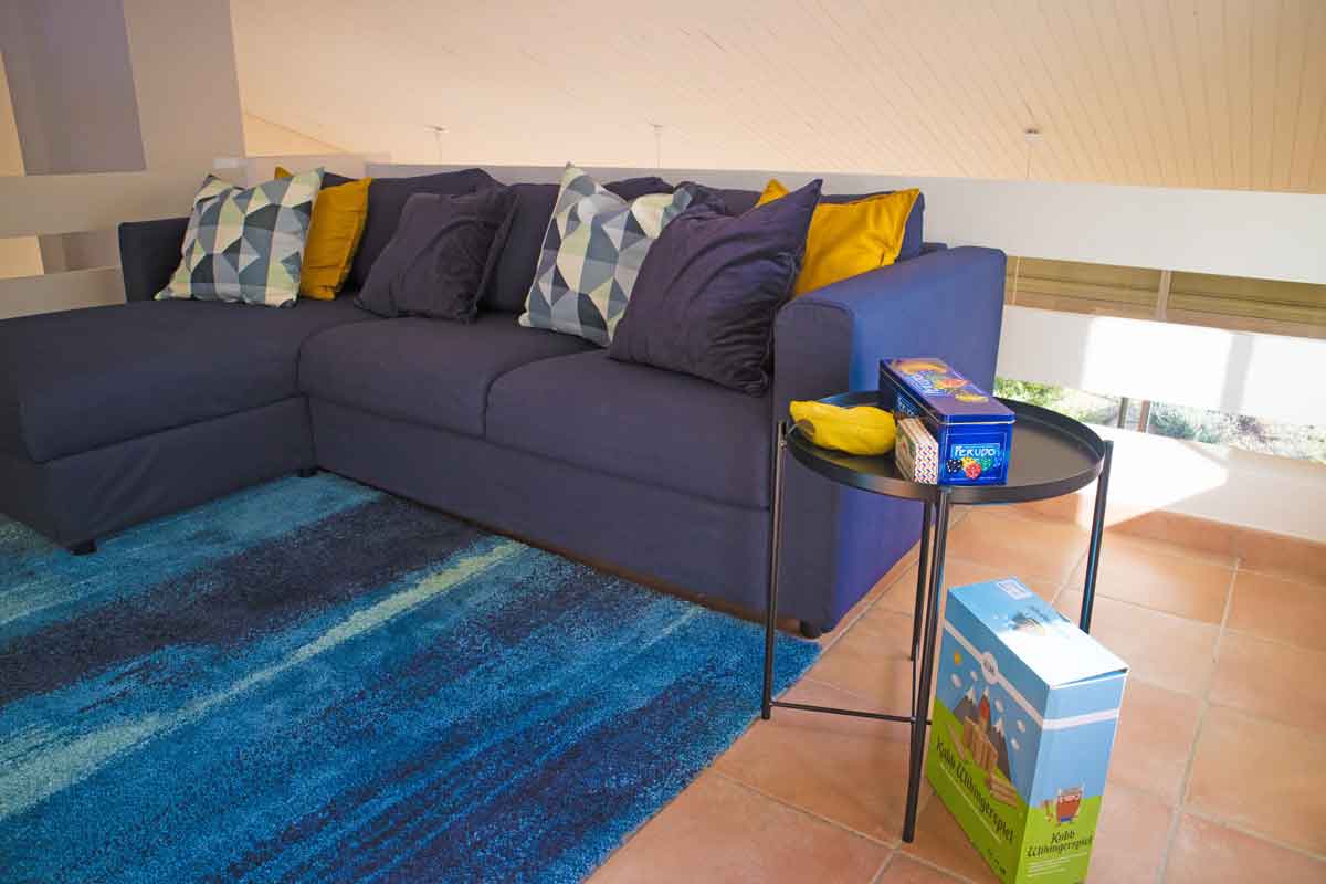 A mezzanine style lounge with sofa and tv, this looks down over the dining area and snug. (Take care with young children).