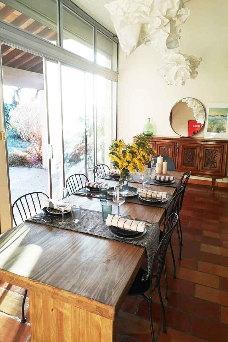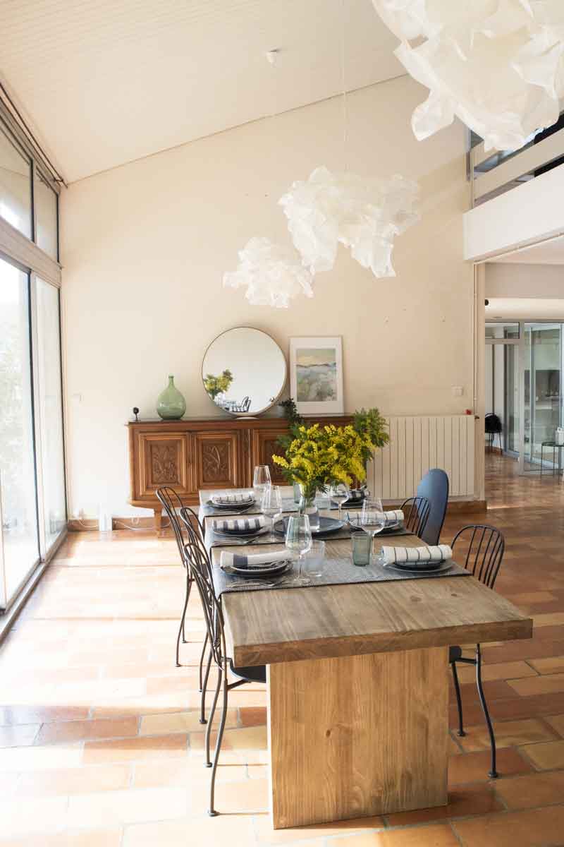 A large dining area is up a couple of steps from the entrance and has sliding doors out to the garden, terrace and pool. The double height ceiling has a fan.