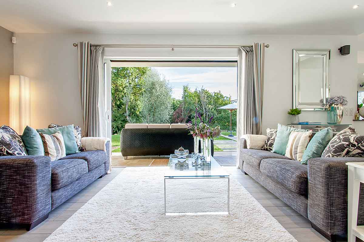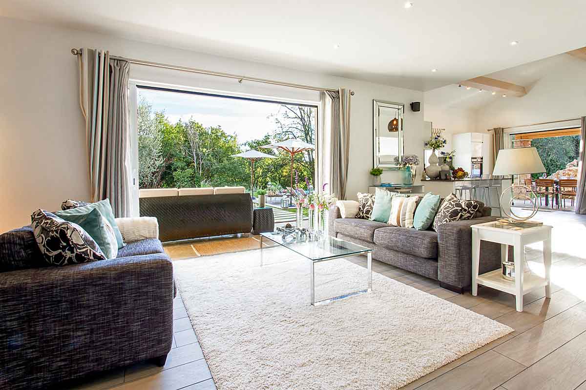 There are twin sofas, a large wall mounted plasma TV and large sliding doors onto the terrace and lawned gardens and woodland beyond.