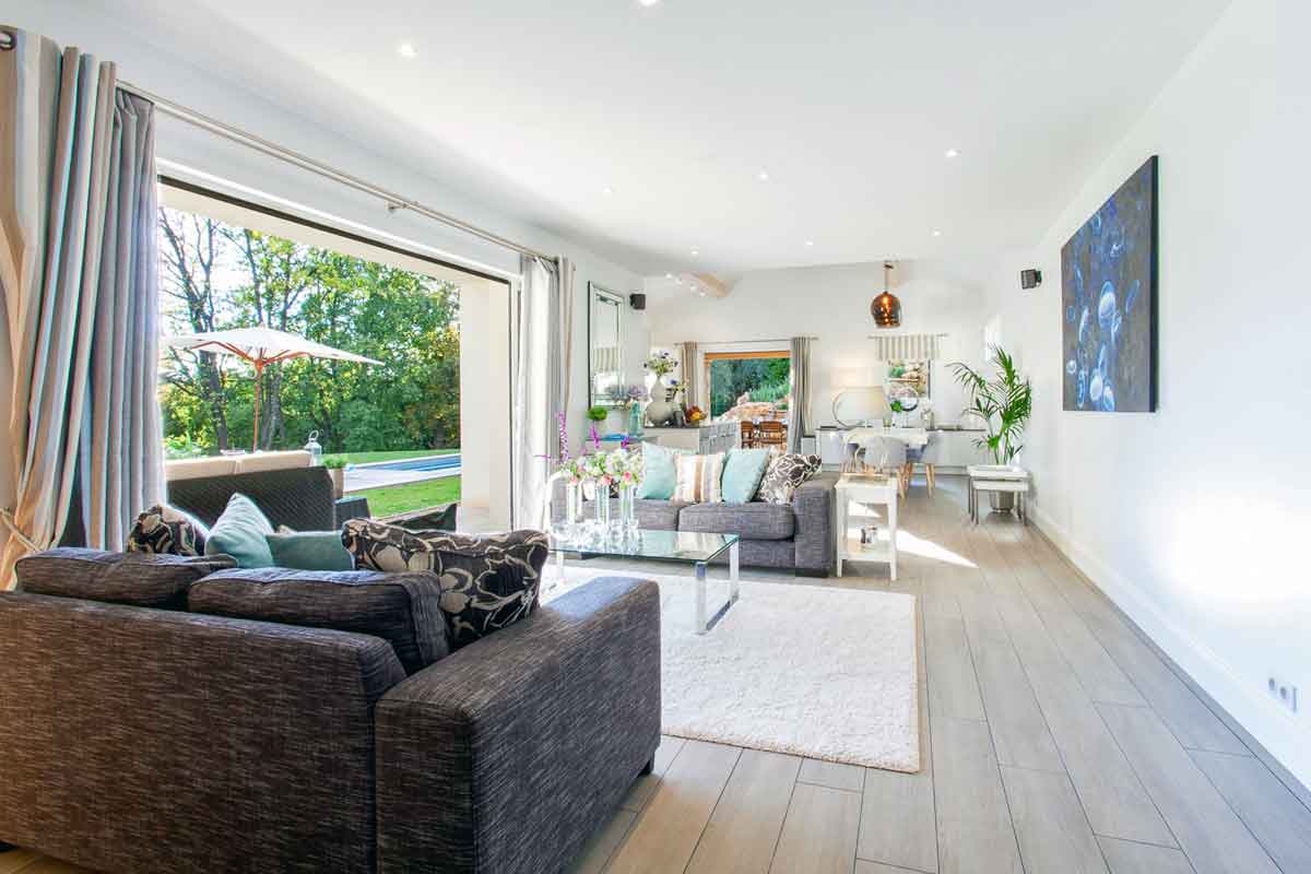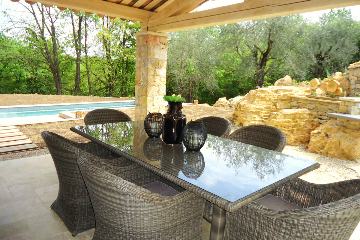 This French holiday rental has been tastefully built in Provencal style. Designed by an interior designer throughout with a lovely light spacious and luxurious feel. The living space is open plan, extremely spacious with large sliding doors onto the lawned gardens and pool area. Lovely views across woodland means this side is not overlooked.