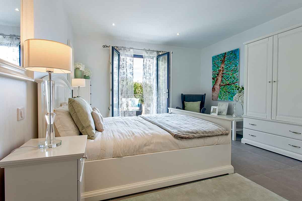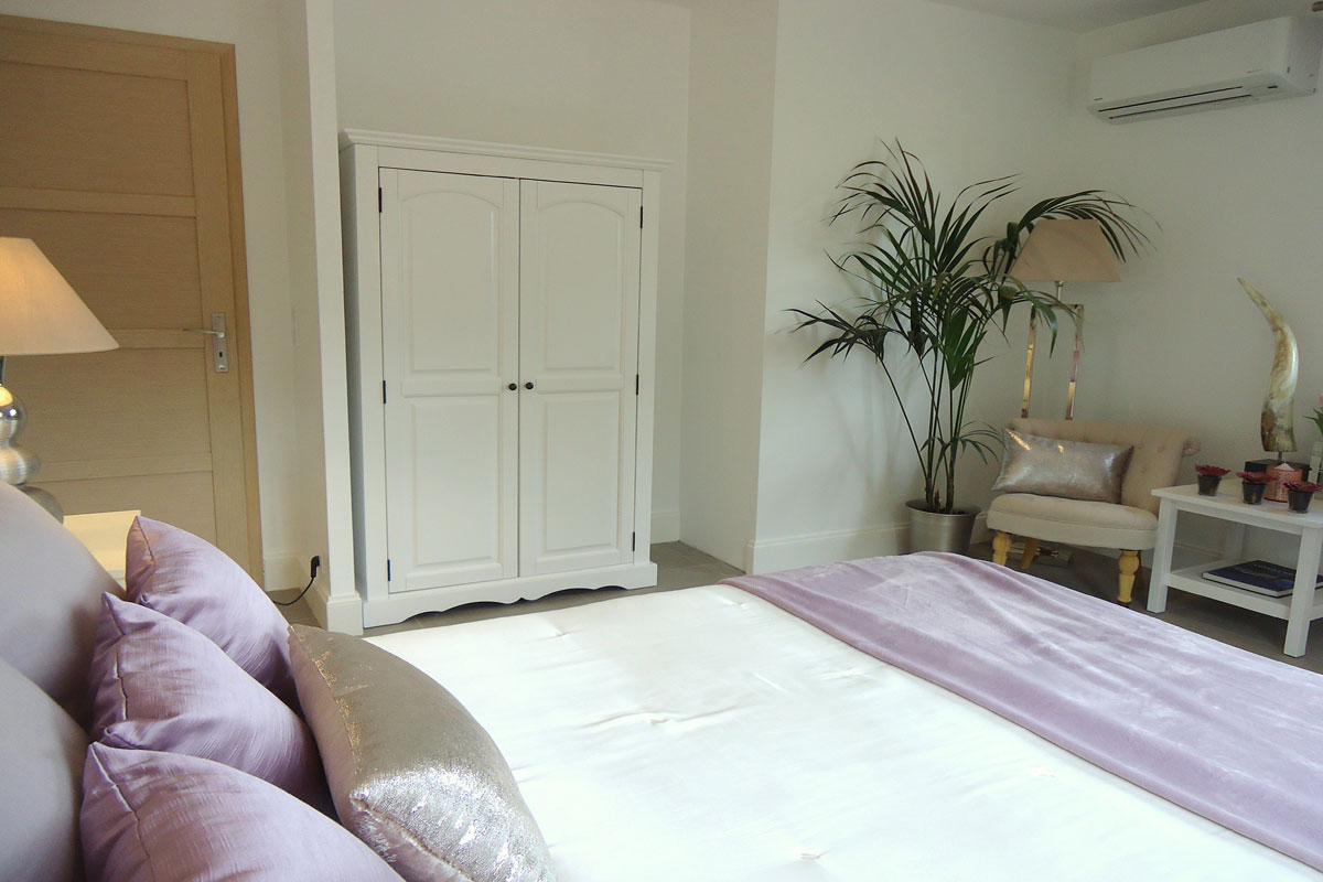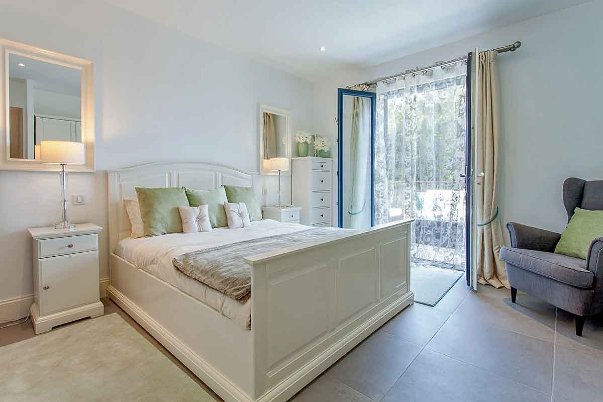 Master Bedroom (Bedroom 1) - king sized bed, wardrobe, furniture and double doors leading onto a private balcony with lounge furniture and railings (ornate railings are being fitted on the low wall on the terrace end of May). Stone steps lead to the lawns and pool. Lovely aspect with views over the pool, gardens and woodland. Air-conditioning.