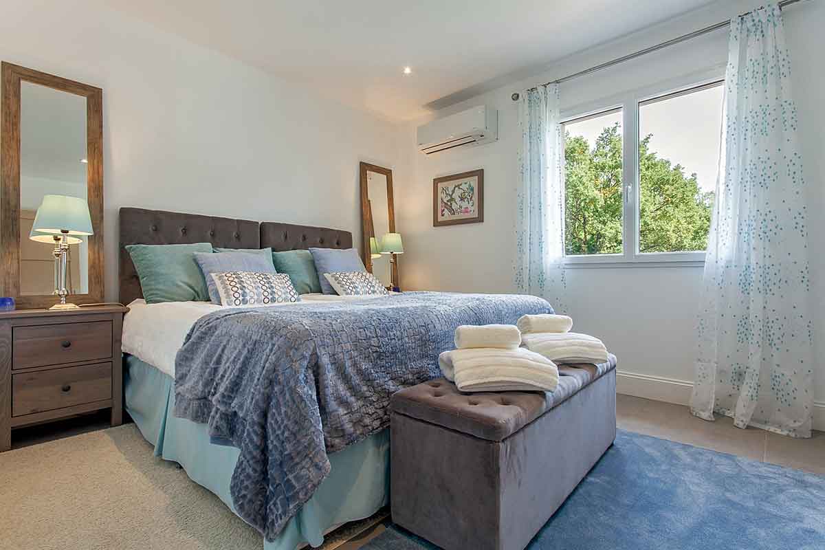Bedroom 4 - double bed, wardrobe and two windows with views over the grounds and pool. Air-conditioning.