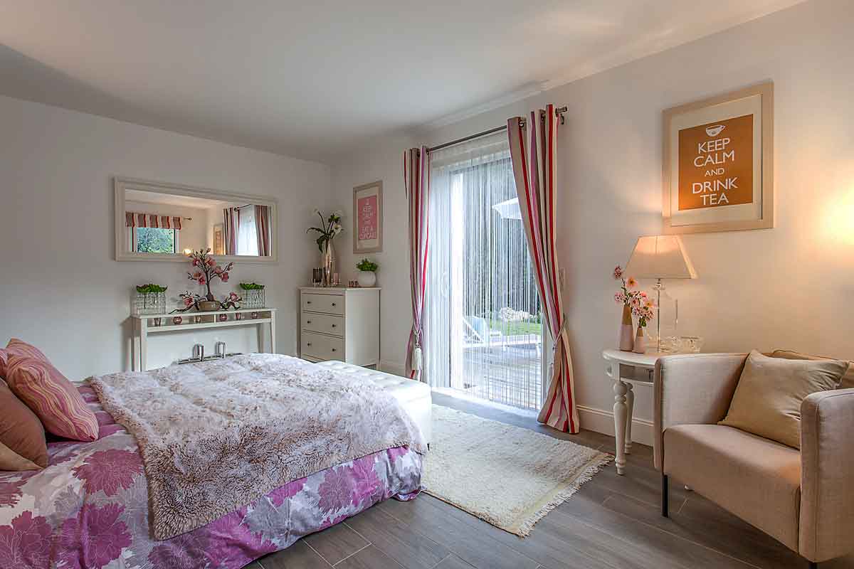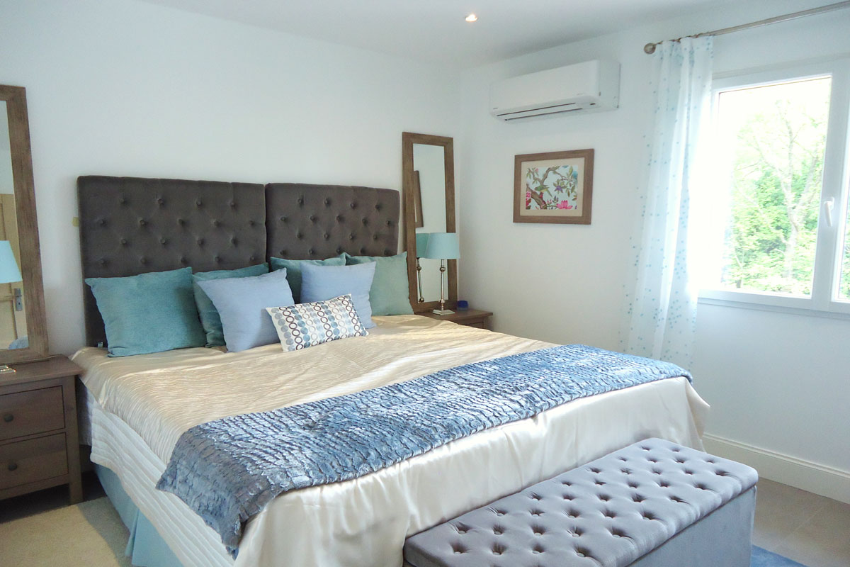 Bedroom 2 - king size bed, built-wardrobes, bedroom furniture, chair, a window plus double doors into the grounds. Lovely aspect with views over the pool, gardens and woodland. Air-conditioning.