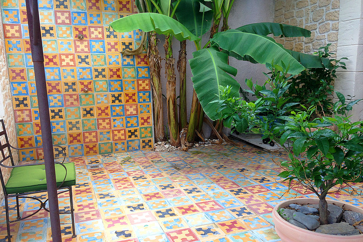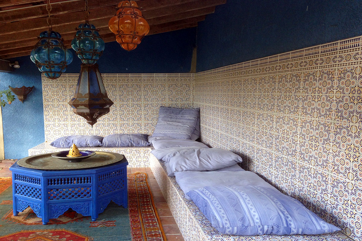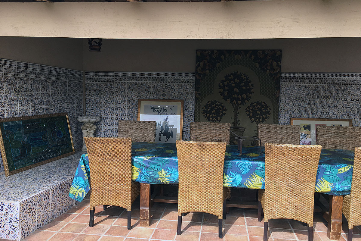 There is a fully tiled Moroccan style covered salon, in shades of blue, with a traditional wooden ceiling, this has been made into an additional outdoor dining area offering shade.