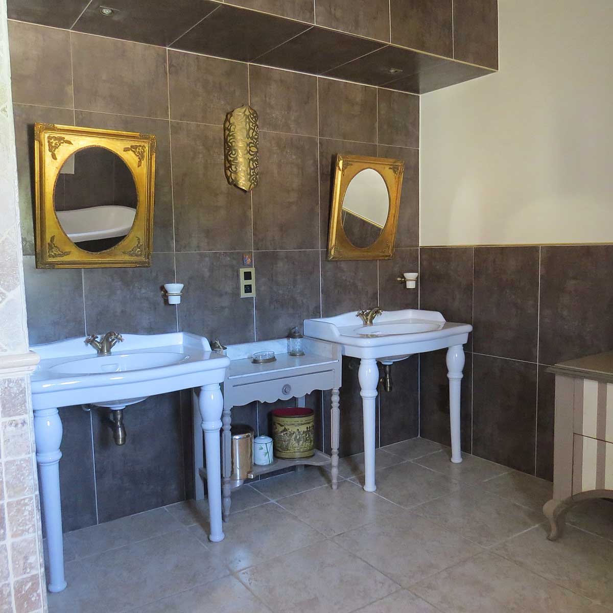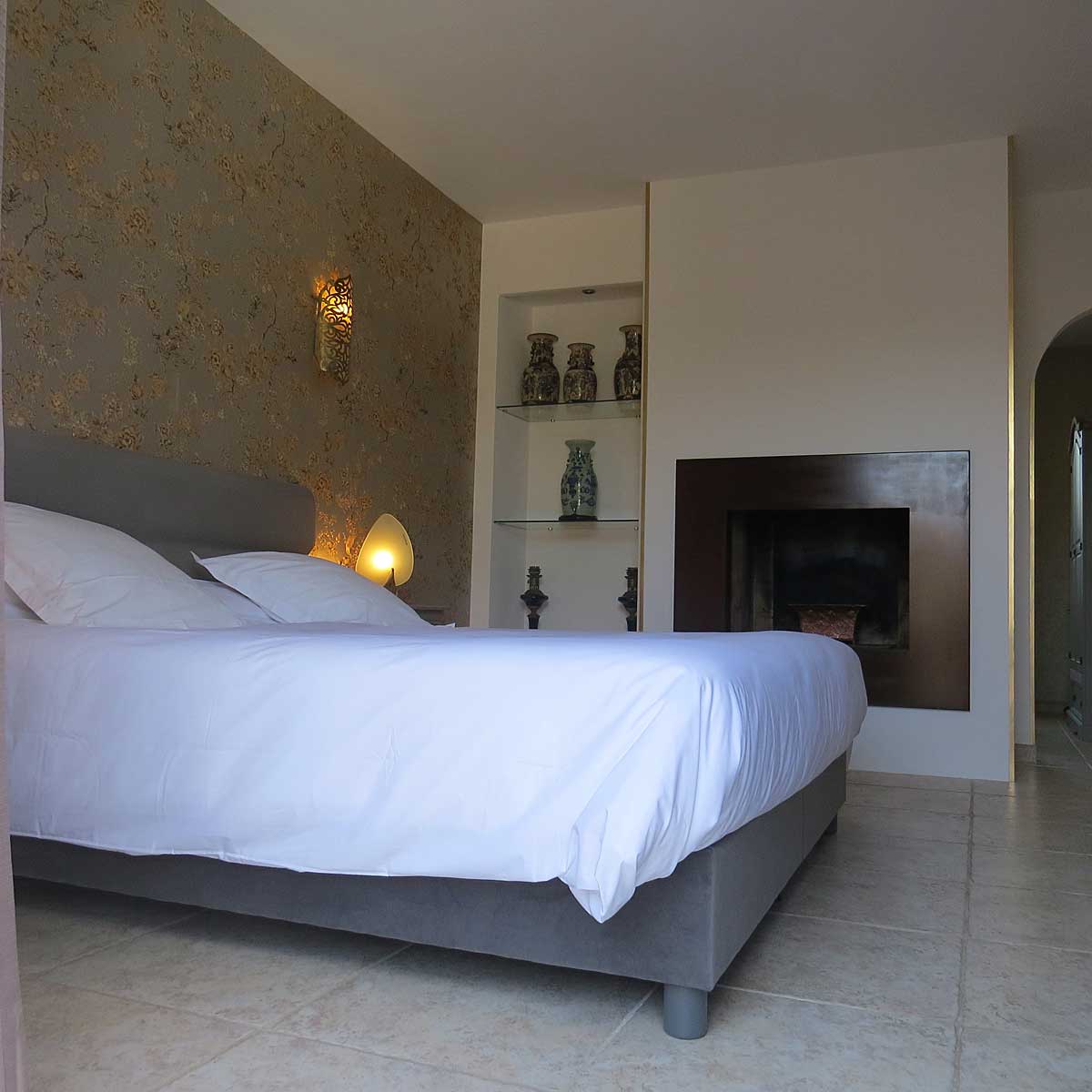 The holiday villa's master bedroom is off the main entrance and is more like a hotel suite! A super king size bed (180cm x 200cm) and modern fireplace. Decorative wrought iron doors lead into the amazing, enormous en suite bathroom. The bathroom is decorated in lovely shades of brown and beige with gold coloured accessories, there is a free standing slipper bath, separate shower, 2 wash hand basins and wc new Air-Conditioning for 2025.