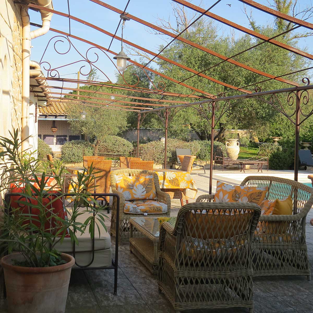 Wrought iron day beds, comfortable loungers along with an outdoor sofa and chairs can be found around the garden and pool area.
