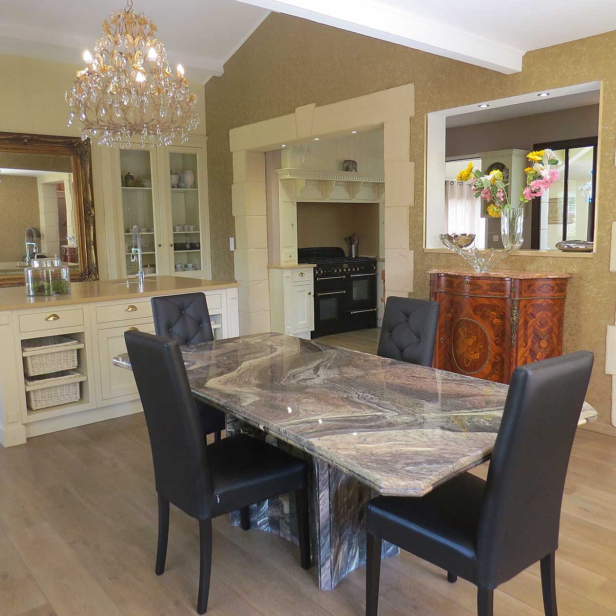 From the kitchen a wide archway leads to the kitchen's second area which has a large island with integral sink and a fabulous backdrop mirror. This is open plan with the dining table which seats 8, pretty chandelier, a small escritoire and interesting ornaments adorn the high alcoves. From here there is a door to the garden.
